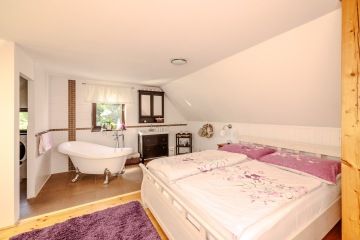 Jednopatrový domek až pro šest hostů, kteří vyhledávají soukromí a klid. V přízemí je kuchyně, obývací pokoj s krbem a rozkvetlá terasa s posezením a opojným výhledem. V prvním patře je pak romantická ložnicie s nádhernou volně stojící vanou.